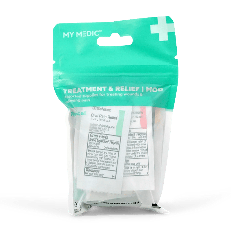 Assortment of supplies to treat wounds and relieve pain. Our MOD system is the perfect solution to re-stock or upgrade your My Medic First Aid Kit.