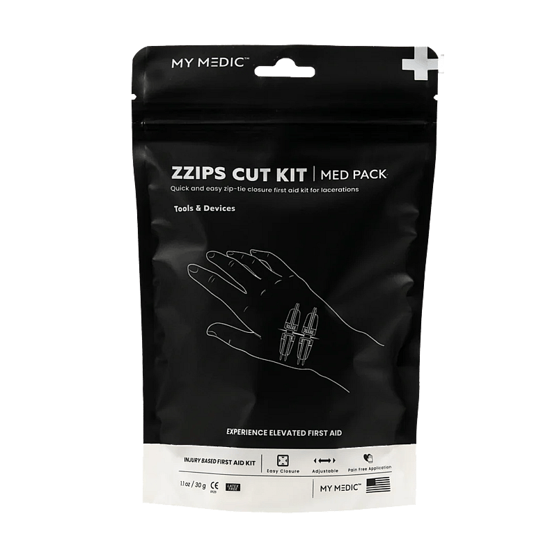 The revolutionary alternative to common sutures and stitches. The ZZIPS MedPack is a compact and portable all-in-one First Aid solution to treat cuts and lacerations where traditional sutures would be needed.